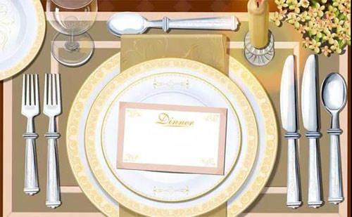 擺吃盤時(shí),底下放一墊盤。刀放盤右,刃朝里;叉擺盤左,尖朝前。