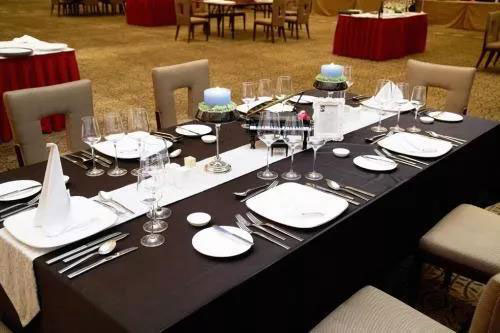 西餐宴會(huì)擺臺(tái)應(yīng)根據(jù)宴會(huì)菜單,選擇各種相應(yīng)的餐具,按上菜順序?qū)⒌?、叉、匙全部擺齊。
