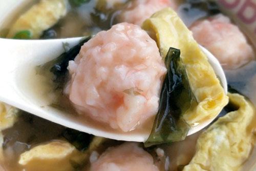 7、水燒開后先把剛才備用的軟面團(tuán)撕小塊扔進(jìn)鍋里,然后把蝦滑擠成丸子慢慢用勺子放進(jìn)鍋里。