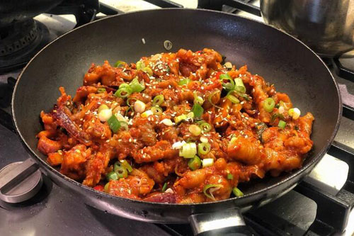 3、油鍋燒熱,入姜片,蒜瓣,干辣椒爆香。倒入牛筋塊翻炒均勻。