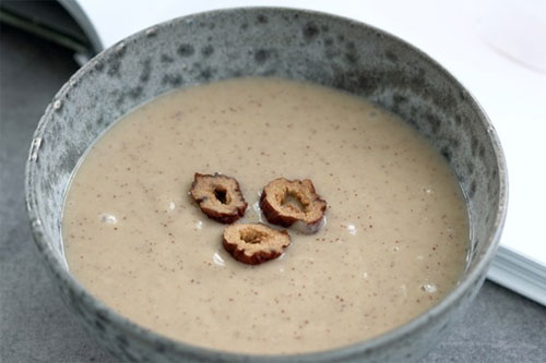 2、將泡好的米和紅棗放進(jìn)攪拌機(jī),和120克水一起打成米漿。
