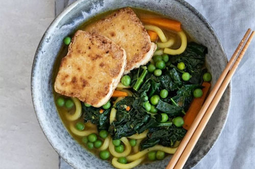 制作食材:蔬菜高湯 350克、蘋果汁 50克、咖喱粉 1湯匙、醬油 1-2茶匙、烏冬面 200克、低筋面粉 1湯匙、水 2湯匙、 紅蘿卜 50克、青豆 50克、綠葉蔬菜 35克、老豆腐 2片