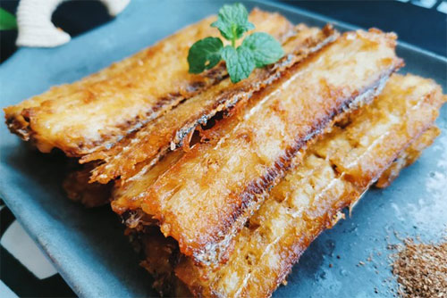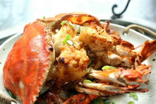 2、分別在蟹塊上均勻蘸上一層淀粉,尤其是切口斷面部分,一定要蘸滿淀粉,鍋中放入油,大火燒至七成熟,再將蟹塊放入,用中火炸至蟹塊完全成紅色,隨后撈出瀝干油分。