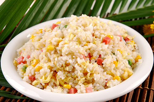 米飯是淀粉類食品,用普通鍋來炒的時候,很容易粘鍋。如果用不粘鍋來炒,就能避免用油過多和粘鍋問題。另外,炒飯時盡量只放一次油。先放油炒香調(diào)料,放入蔬菜丁、豌豆丁、香菇丁等,炒到半熟時,加入米飯同炒,最后把雞蛋打散倒入鍋中,令其均勻地粘在米飯表面上,就可以達到少油又美味的“金裹銀”效果。
