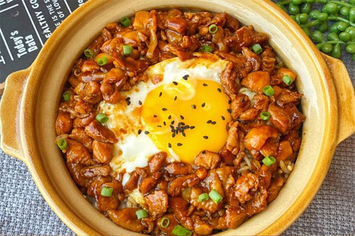 3、煎一個(gè)溏心糖,雞丁下鍋煎至兩面金黃倒入醬汁中火慢慢收汁,雞蛋鋪上翻面再鋪上雞丁撒上蔥花即可。
