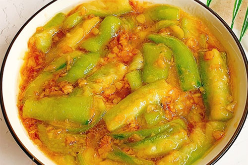 2、鍋中熱油倒入蒜末,爆香,倒入腌制好的絲瓜,翻炒至炒軟。