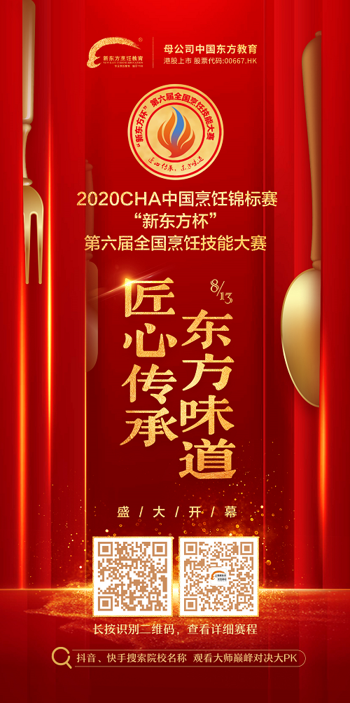 華美食文化,弘揚大國工匠精神,展現(xiàn)新東方烹飪學(xué)子風(fēng)貌。由中國飯店協(xié)會、中國東方教育主辦的2020CHA中國烹飪錦標(biāo)賽“新東方杯”第六屆全國烹飪技能大賽(上海賽區(qū))倒計時火熱籌備中。