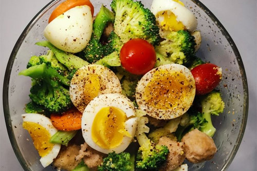 2、把雞蛋煮熟切成四塊,西藍花掰小朵焯水,丸子焯水,撈出后放入沙拉碗中。