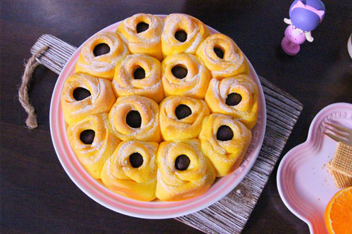 11、壓好的月餅放盤(pán)里墊上保鮮膜冷凍8小時(shí)以上,完全凍硬,烤箱上火210度,下火160度,預(yù)熱后10分鐘,把月餅從冰箱取出,重新放在新的烤盤(pán)里,中上層8-10分鐘,根據(jù)烤的數(shù)量和烤箱脾氣,中間6分鐘后表面刷薄薄一層蛋黃液 月餅腰部微微鼓起即可。