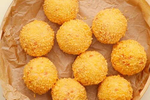 3、搓成小圓球,按一個窩窩,包入芝士塊,搓圓。