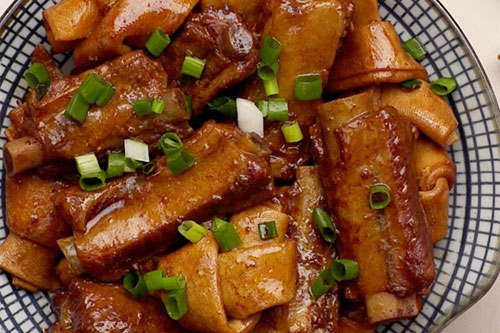 制作食材:排骨 600g、千張(豆腐皮) 250g、大蒜 40g、生姜 2片、食用油 10g、大蒜 35g、花椒 3g、八角(大料) 3個(gè)、干辣椒 10g、生抽 10g、老抽 10g、鹽 2g、清水 500g、小蔥 根據(jù)口味添加