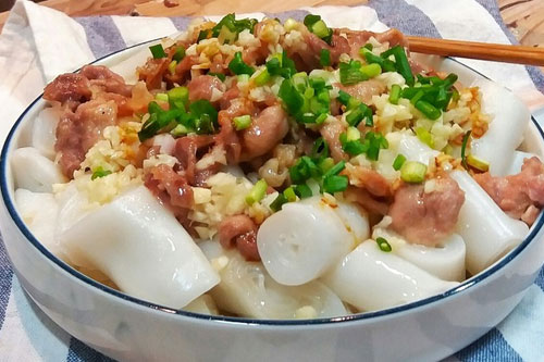 5、瘦肉蒸至轉(zhuǎn)白色即可熄火,撒上蒜蓉。