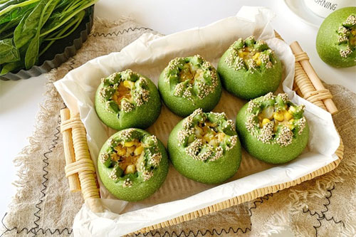 制作食材:菠菜面團 高筋面粉 260克、雞蛋 1個(55克)、鹽 3克、糖 25克、酵母 3克、菠菜汁 125克、無鹽黃油 20克;沙拉餡 熟土豆 100克、熟玉米 50克、肉松 25克、沙拉醬 20克、白芝麻 適量