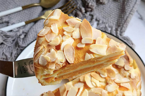3、倒入模具中,最后撒上一層杏仁片,放入烤箱,上下火200度烤20分鐘即可。