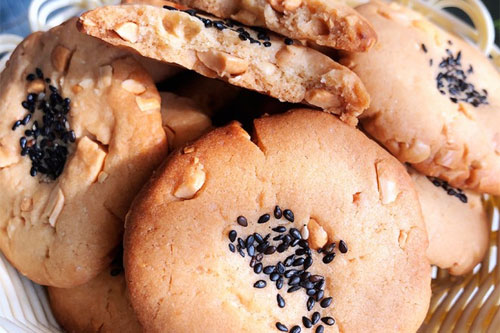 制作食材:普通面粉 200克、雞蛋 50克、細(xì)砂糖 55克、玉米油 90克、小蘇打 2克、泡打粉 2克、黑芝麻 適量、鹽 2克、花生 60克