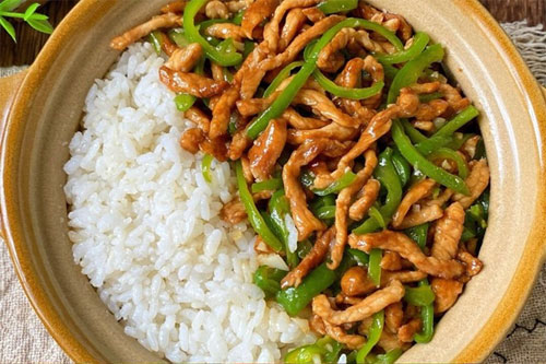 4、鍋中放油煸香蒜末,放入青椒絲炒斷生,倒入肉絲和醬汁煮至濃稠倒在米飯上即可。