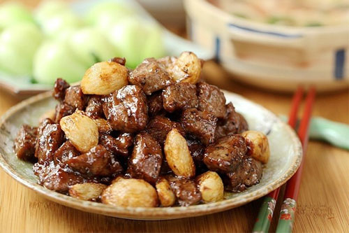 6、把鍋中滑肉用過的油倒出來,開小火在炒鍋中放入十多克的黃油,把牛肉倒入鍋中烹入醬油和料酒加入糖、蠔油、黑胡椒碎,放入已經(jīng)炸黃的蒜子,翻炒兩分鐘即可。