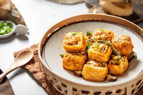 6、把筍片香菇鋪在碗底,然后把做好的鮮肉豆泡碼上去,送入蒸箱,100度,25分鐘,蒸完取出,撒上蔥花淋一些香油即可。