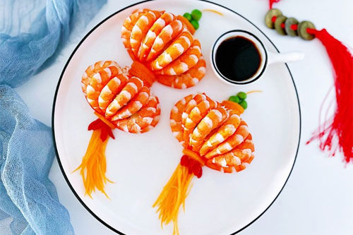 3、土豆泥團(tuán)成半圓放入盤中擺上蝦仁,胡蘿卜豌豆粒枸杞裝飾。
