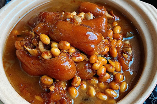 制作食材:豬蹄 2只、泡發(fā)好的黃豆 一小碗、料酒 2勺、蔥姜 少許、老抽 2-3勺、六月鮮豆瓣醬 2勺、冰糖 幾顆、香葉、八角 少許、鹽 少許