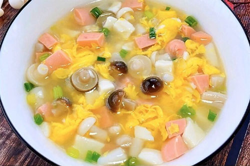 1、海鮮菇洗凈切小段,火腿,豆腐切丁,雞蛋打散備用。