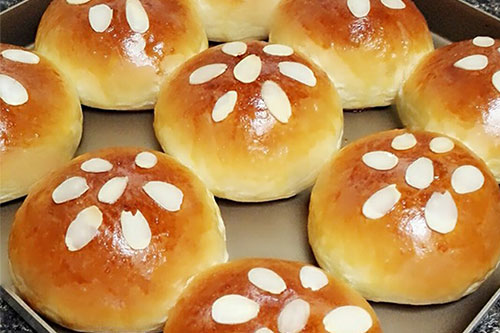 制作食材:高粉 270克、低粉 50克、雞蛋 1個(50克)、牛奶 60克、糖 35克、鹽 1克、酵母 3克、黃油 25克、溫水 50克、杏仁片 適量