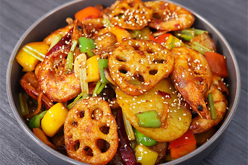 5、倒入炸好的土豆片藕片和大蝦翻炒均勻,再放入芹菜段、青紅黃椒塊、1勺生抽、1勺蠔油翻炒至斷生即可。