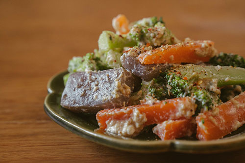 1、胡蘿卜削皮切小段、西藍(lán)花洗凈掰小朵、魔芋搓洗干凈后切小塊。