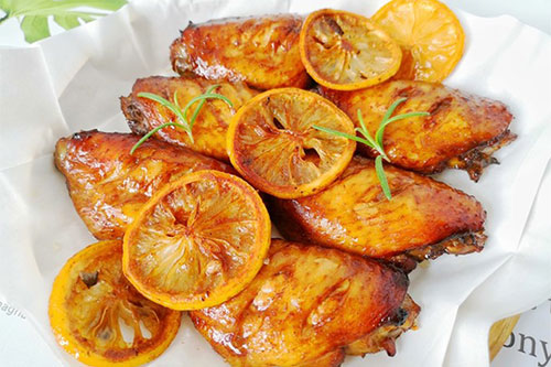 3、腌制好的雞翅均勻地?cái)[在烤網(wǎng)上,上面蓋上一片檸檬,烤箱上下火190度烤25分鐘,把雞翅翻面,刷上一層剩余的腌肉料,再放進(jìn)烤箱烤5分鐘即可。