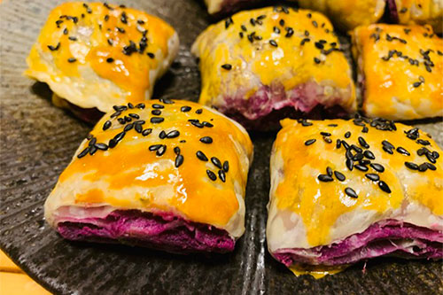 制作食材:紫薯 4個(gè)、手抓餅 2個(gè)、奶粉 30克、雞蛋黃 1個(gè)、黑芝麻 適量、牛奶 20克