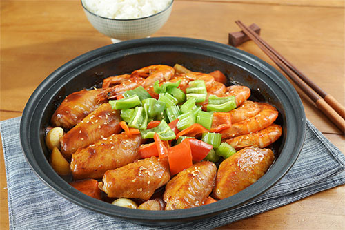 制作食材:雞翅 7-8個(gè)、大蝦 10個(gè)、紅薯 120克、土豆 120克、胡蘿卜 120克、西芹 80克、青甜椒 1個(gè)、紅甜椒 1個(gè)、姜蒜 適量