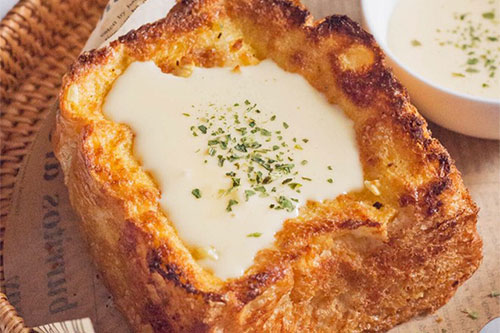 4、牛奶加芝士片小火攪勻,淋在烤好的吐司上,最后撒一點(diǎn)歐芹碎即可。