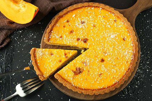 9、待南瓜派冷卻后放入冰箱冷藏20分鐘后再取出,撒上椰蓉碎裝飾即可。