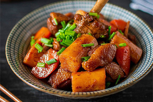 4、加熱水沒過鴨塊大火燒開,加蓋,轉(zhuǎn)小火燜30分鐘左右,然后放入山藥、胡蘿卜,加蓋繼續(xù)再燜15分鐘左右即可。