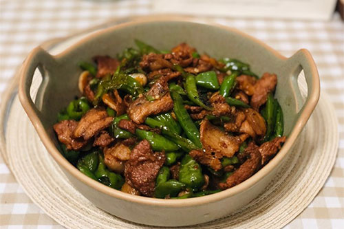 4、倒入辣椒,翻炒讓辣椒充分的吸收炒肉的湯汁,調(diào)入適量鹽和雞精即可。