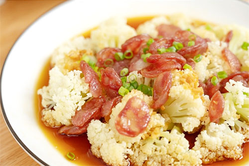 2、花菜鋪在盤子上,淋上調(diào)好的料汁,再鋪上臘腸,放入悠伴蒸汽炸鍋,設(shè)置蒸汽模式12分鐘,撒上蔥花即可。