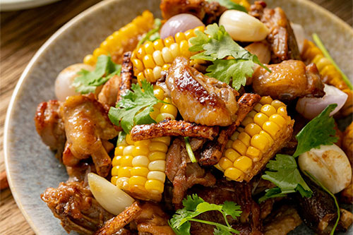 制作食材:走地雞 半只、五指毛桃 10g、甜玉米 1個(gè)、生姜 1塊、紅蔥頭 2個(gè)、大蒜 4顆、料酒 1大勺、生抽 1大勺、柱候醬 1大勺、糖 2小勺、淀粉 2小勺、鹽 1小勺、香菜 3根