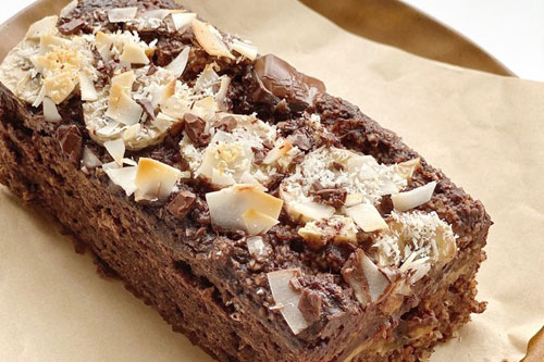 5、模具里鋪好油紙,然后把攪拌均勻的可可糊倒一半進(jìn)去,然后放上香蕉和黑巧克力碎,再把剩下的可可糊倒進(jìn)去,頂上放香蕉片、椰蓉碎和黑巧克力碎,烤箱180度烤20分鐘即可。